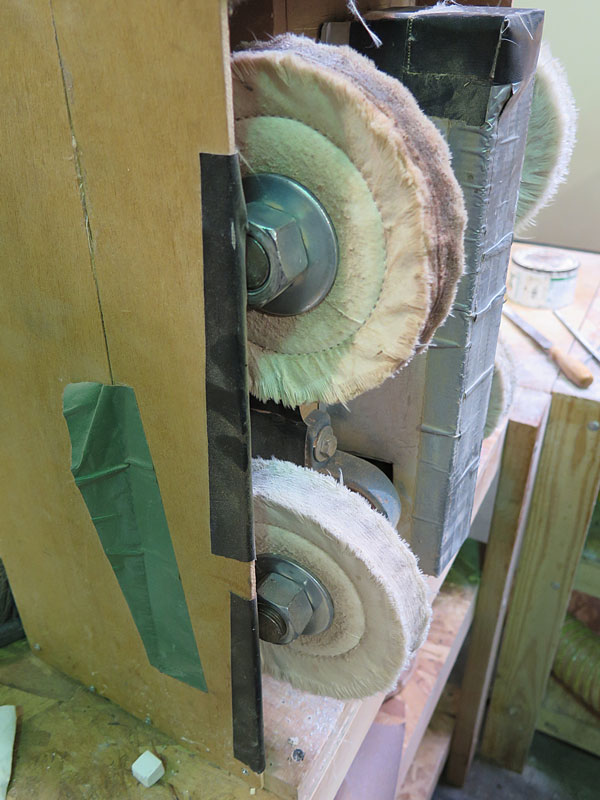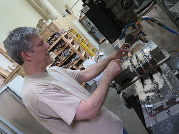 His computer-controlled lathes cut the handle shapes with two or three different cutters and produce a fairly nice finish right off the machine. Then the handles are mounted on another shop-made machine – basically a motor with a chuck and a mandrel – for some light sanding.