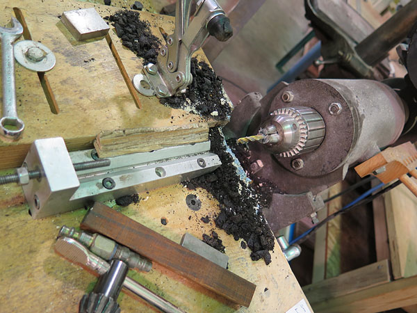 Handle stock is typically bored with a horizontal boring machine right before it is placed on the mandrel of the lathe. Then it is secured with a tailstock. Because none of his lathes came with a tailstock, Jeske has built ingenious devices to secure the work.