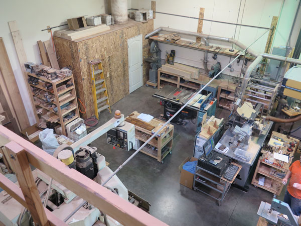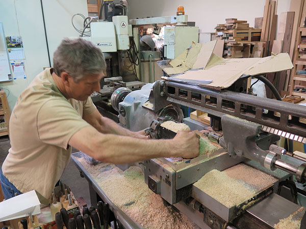 Most of the rough milling at Blue Spruce takes place on typical woodworking equipment – a radial-arm saw, cabinet saw, band saw and drill press handle most of this work. Almost everything starts out as a rectangular block of wood, Jeske says.