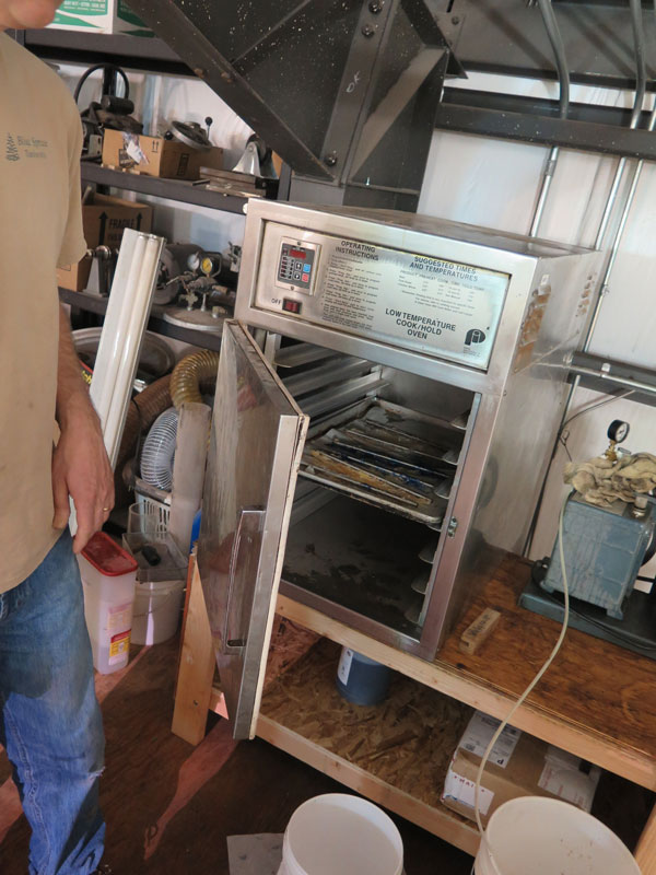 During the visit, I was surprised to learn that Jeske infuses some of the wood himself. The wood is first placed in a vat with the resin. Then the resin is pushed into the wood under pressure, a process that takes about a day. Afterwards, the resin-infused sticks are cooked in an oven – heat cures the resin into its hardened state.
