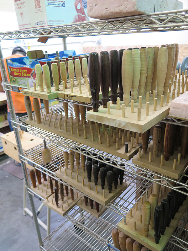 Rosewood handles are then buffed with carnauba wax and are ready to go. Other species are first polished with an oil/varnish blend and are placed in a homemade oven to speed drying.