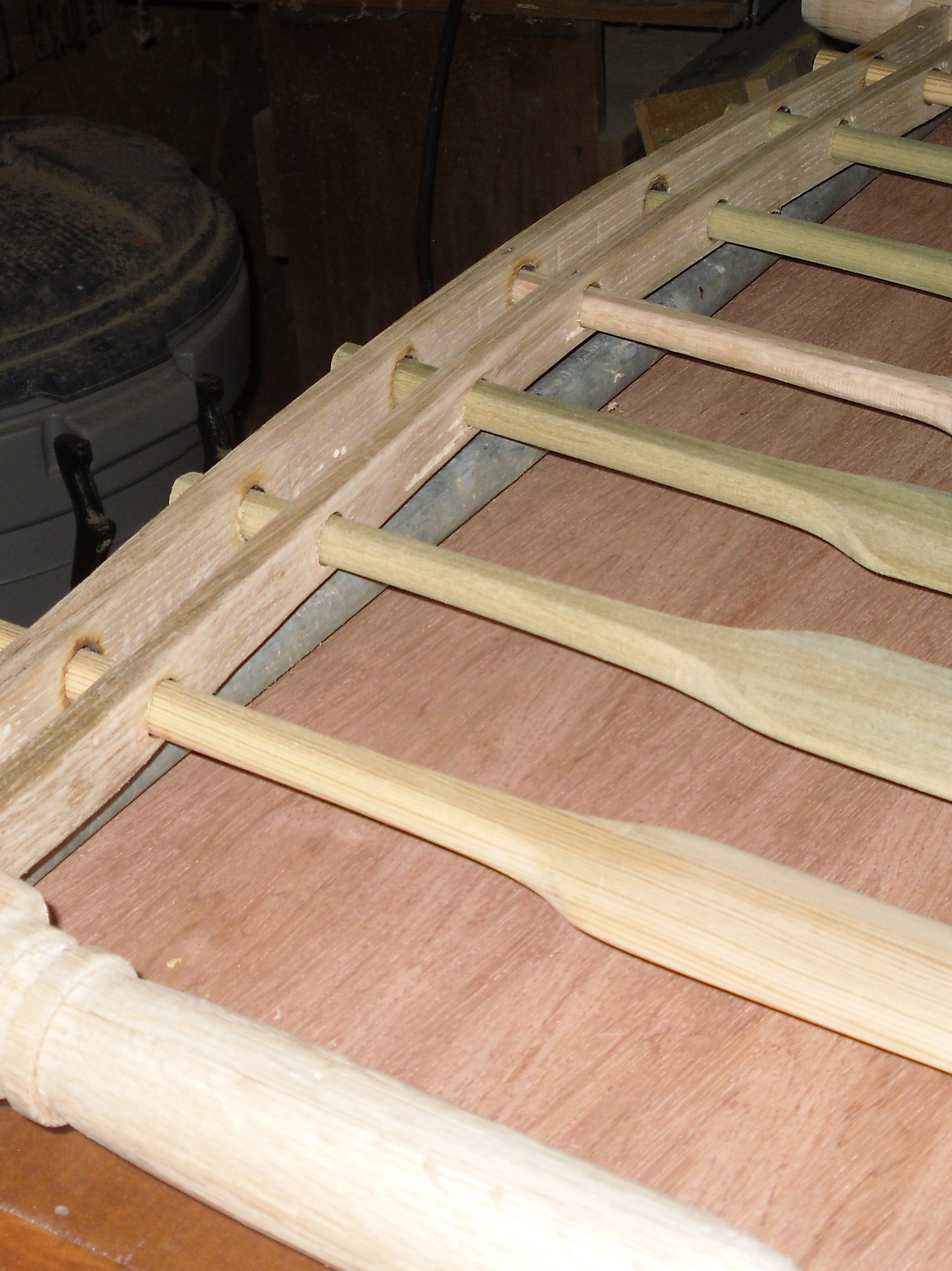 How the spindles pass through those crest rails. I had to make a jig to drill through both crest rails and into the bottom rail. Spindles were later trimed on the ends, and a sawkerf was added. A wedge was then use to fix the spindles in place.