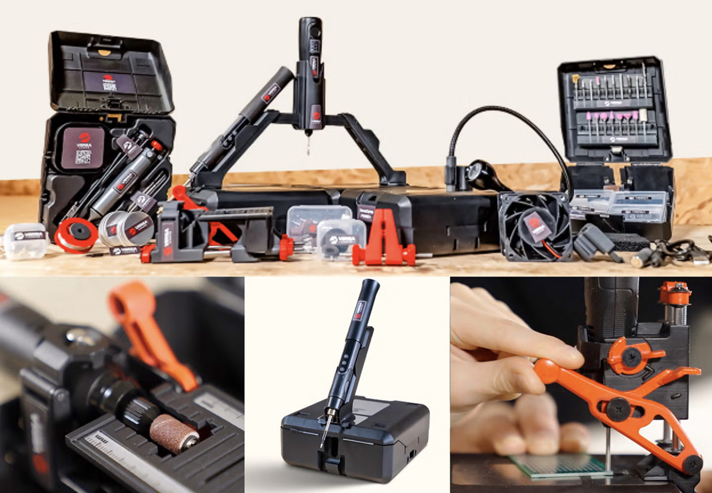 The concept revolves around two main components — a basic rotary tool and a soldering iron. But those are designed to work with a series of mounts, jigs, holders, swappable tooling, and a host of bits and cutters. Using the various mounts turns the basic parts into a (very) small table saw, drum sander, drill press, and more. There’s even a fume extractor as part of the system to allow use anywhere without creating too much of a mess. You undoubtedly have all those things already, and if you have a Dremel rotary tool you can probably already do everything this can.