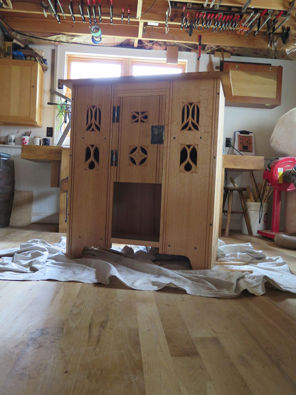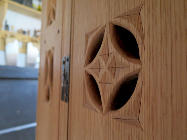 I love the piece; it is so different from Shaker or arts and crafts pieces. and yet it shares so much with those later evolutions. I am curious how you chose the particular gothic designs for the faces, though. Gothic carvings generally have symbolic significances. If you’re at liberty to say, what’s your source?