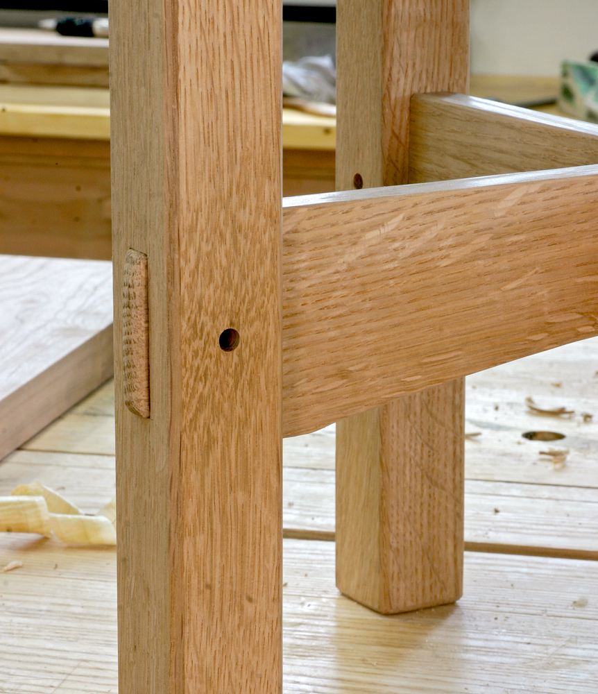 Exposed joinery is one of the key elements in Craftsman furniture, through mortise and tenon joints in particular. It’s a detail that even people who know nothing about woodworking notice and appreciate. If you pick up a tool catalog you’ll find all sorts of devices that promise to make this type of work possible, and you’ll find numerous articles online, in books and in magazines that suggest complex solutions and specialized tools as being absolutely necessary to make these joints. It’s easy to get sidetracked by all of that and put this work in the “someday I might be able to do that” category. That’s a shame, because what you see in a good exposed joint is the most basic skill in woodworking, executed consistently. And that skill isn’t dependent on any particular tool, or collection of tools, orientation towards product or process, or adoption of anyone’s school of thought.
