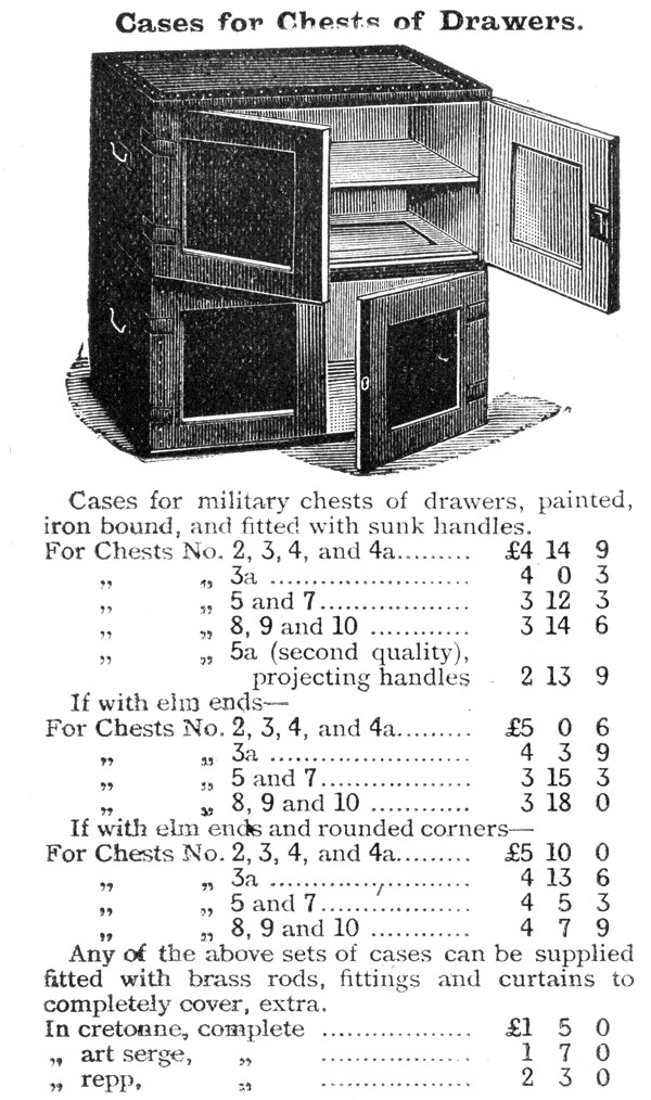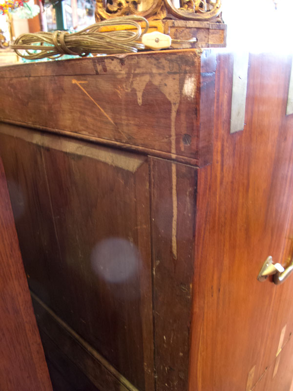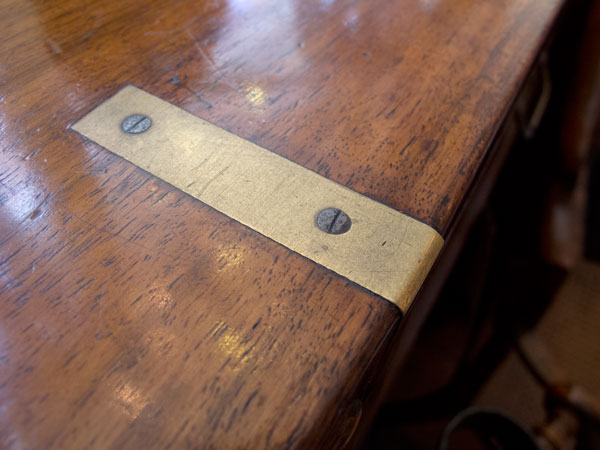 I came to Skinner’s to see his very rare case for a military chest. During the 19th century, these were sold separately in a variety of sizes to protect your campaign chest during a journey. When you got to your destination you removed the campaign chest and used the case as a wardrobe. Many of these cases were oak and painted. This one was made from an exotic wood, dovetailed (with half-blind mitered dovetails) and given the full brass treatment.