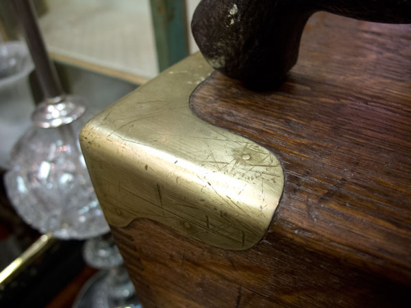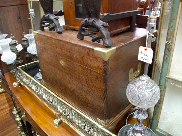 Down the street at Tucker Payne Antiques was a trunk that was unusual because of its size – it’s about one-third bigger than typical campaign trunks. The trunk looks like it is made of teak, and the brasses suggest it was made in China or India because they are nailed on instead of screwed.