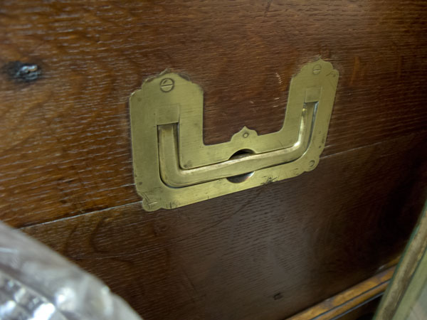 The first is a trunk that is finger-jointed and made using quartersawn oak. What is particularly interesting is that the brasses suggest the trunk was made outside of England, such as in India or China. But it’s a bit unusual to see those pieces made in oak. They would usually be made in camphor or something else indigenous to the area.