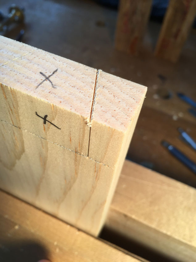 Saw a shallow kerf in the end grain that follows your knife line.