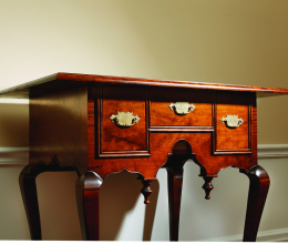 When working on the lowboy discovered in the back room at the Connecticut Historical Society, I set up to drill a couple of holes in the front lower rail. Instead of clamping a fence in position at my drill press, I grabbed a small block to use as a guide. Why I drilled the holes for the two drop finials this early in the game is to head off a problem I had as I assembled the Queen Anne Dressing Table in the June 2010 issue (#183).