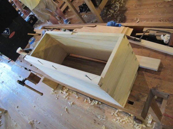 I built this lower unit while simultaneously teaching a class on building the upper unit at Roy Underhill’s The Woodwright’s School – with the help of your helpful editor, Megan Fitzpatrick. Here are some details of the lower unit’s construction (a SketchUp drawing and cutting list can be found in this earlier entry).