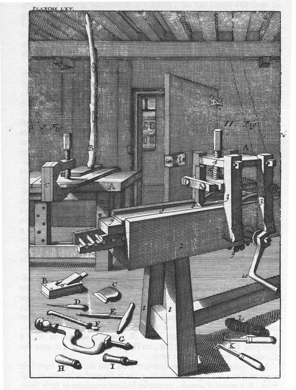 Félibien (1619-1695), was an early and important art critic and published a book in 1676 on the tools and processes used by woodworkers, sculptors, painters and architects called “Principes de L’architecture….”