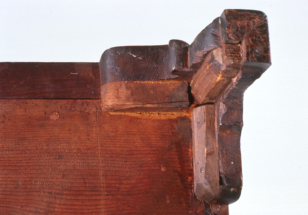 Cross-grain gluing and consideration of expansion and contraction wasn’t a universal primary concern. Now, I know the first photo isn’t of feet, but it illustrates my point. The Boston card table top is attached to the base of the table with…glue blocks; both with and across the grain. This is not atypical for period construction.