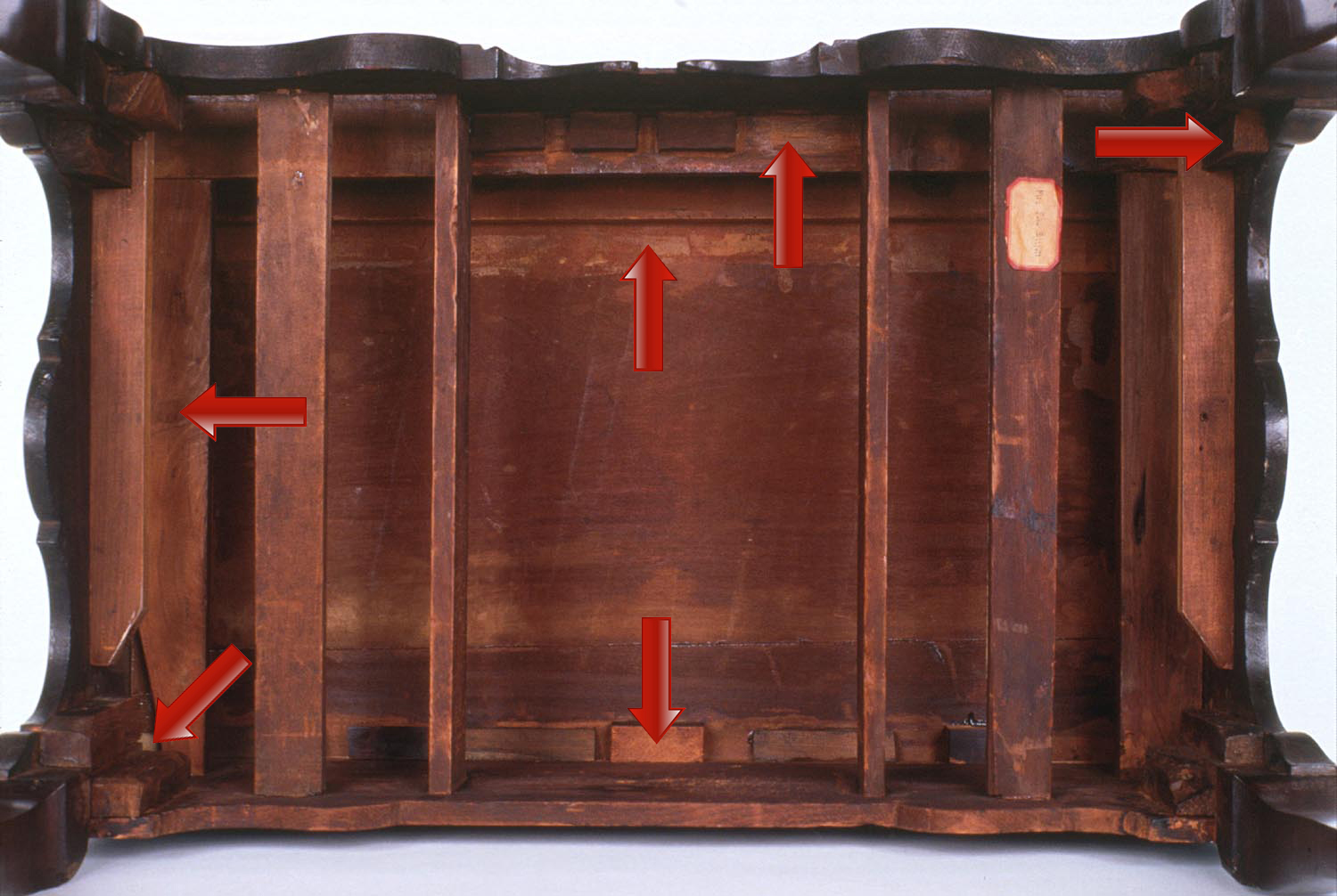The central upward pointing arrow indicates a place where glue blocks once resided. None are there now, but it’s clear when looking at the underside of the top, they were there right between the top front rail and the underside of the top. The coloration underneath the glue tells me if the glue blocks weren’t original, they were extremely early in the life of the lowboy or there would have been some oxidation prior to their inclusion.