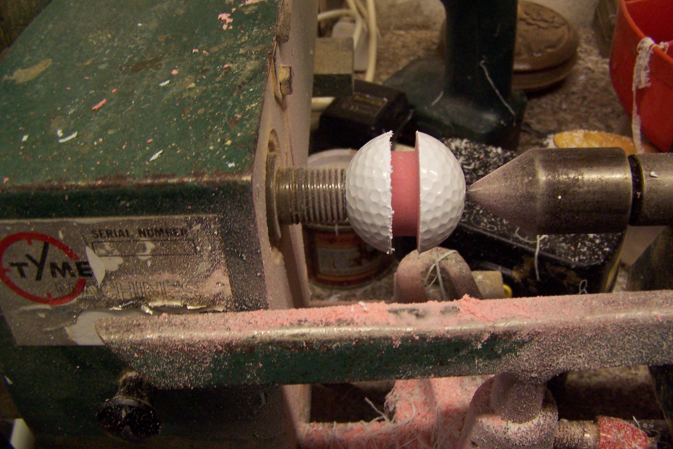 THIS GOLF BALL IS 42 MM DIAMETER? THIS I PUT ON THE LATHE AND UNDERCUT CENTRE DOWN TO 20 MM AS SEEN?THE HOLE IN OAK IS 22.50MM .AS I TRY TO DO THE IMPOSSIBLE ?I HAVE MADE THIS POSSIBLE? THE BALL IN/THROUGH THE OAK. I MADE THE UNDERCUT 20MM X 20 MM WIDE SO WHEN IT GOES THROUGH THE OAK IT CAN BE SPUN AND MOVE 5 MM EITHER WAY. THE OAK IS KILN DRIED AND IS 16 MM THICK.AND SOLID. (DO NOT TRY THIS AT HOME WITH GOLF BALL AS TURNING BALL ON THE LATHE CAN BE DANGEROUS) IF YOU DO TRY IT USE GOGGLES? YOU WILL SEE NEXT TIME THE GOLF BALL IN THROUGH OAK. THIS DESIGN I DID WAS EASY TO THINK UP,AND TOOK 3/4 OF AN HOUR TO WORK OUT SIZES /ANGLES/AND DIMENSIONS,,BUT IT TOOK ME NEARLY A DAY TO PER-FECT. BUT ONCE I DID IT ,IT WAS SO IMPOSSIBLE TO WORK OUT HOW..!!! THIS WILL BE ADDED TO THE OTHER ILLUSIONS AND PUZZLES THAT WILL BE SEEN AT RIPLEYS MUSEUM IN ORLANDO FLORIDA. IF YOU PUT YOUR MIND TO WHAT EVER YOU WANT TO DO IN LIFE? YOU WILL ACHEIVE IT. NEVER UNDERESTIMATE YOUR OWN TALENTS.!!!!!!!!!!!?