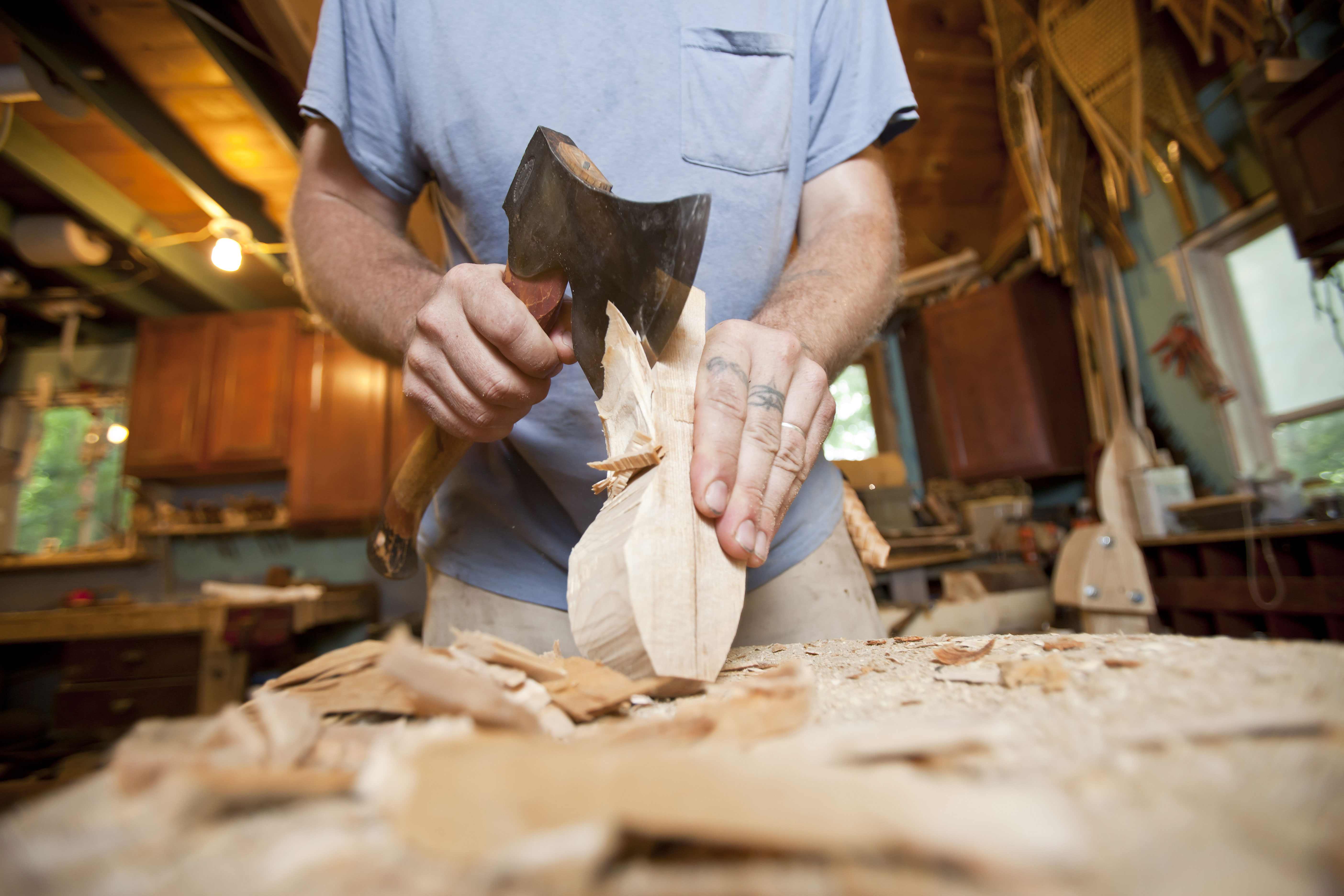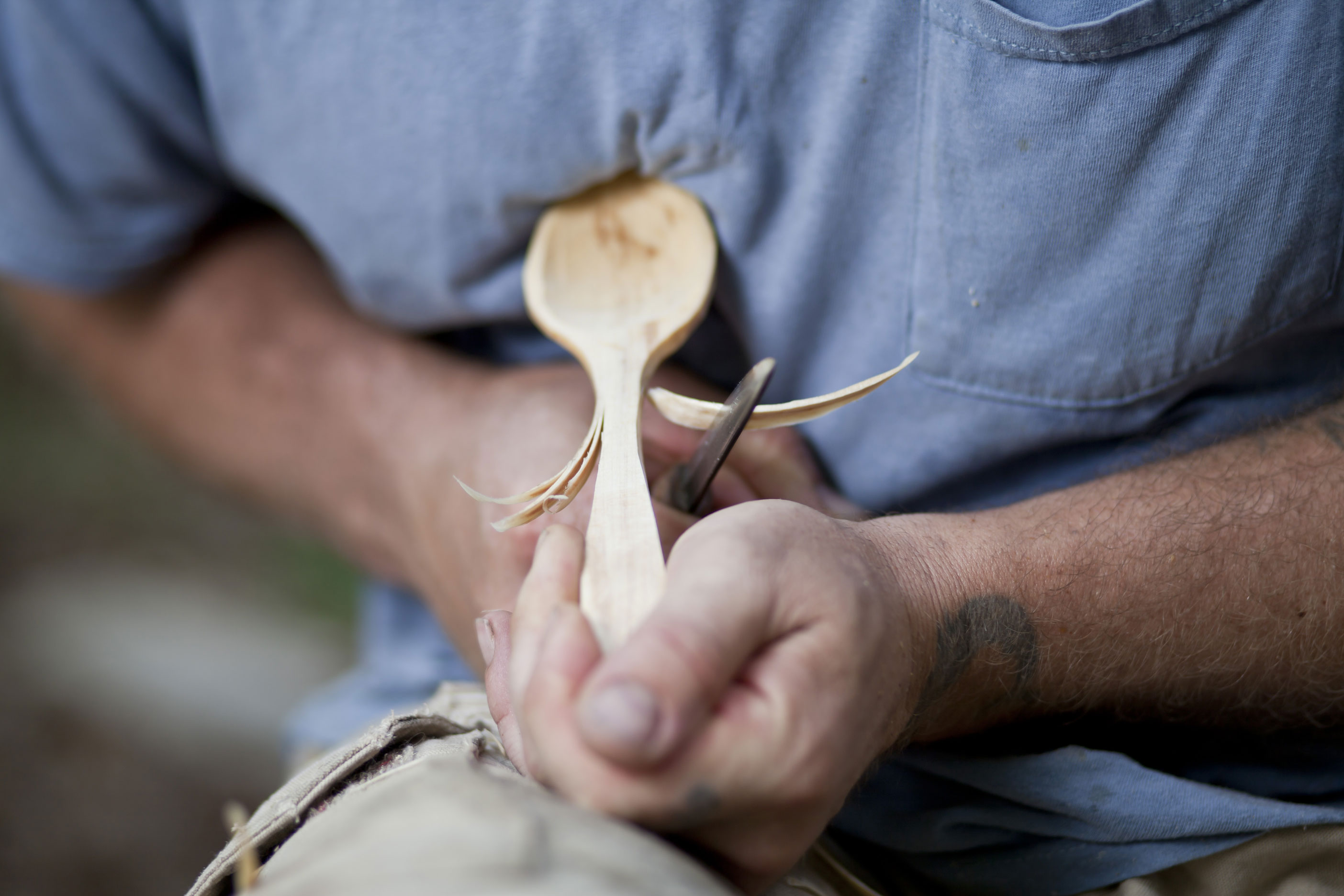 Green woodworking begins with the most basic of tools and material. Jarrod StoneDahl cuts into a new spoon, above.