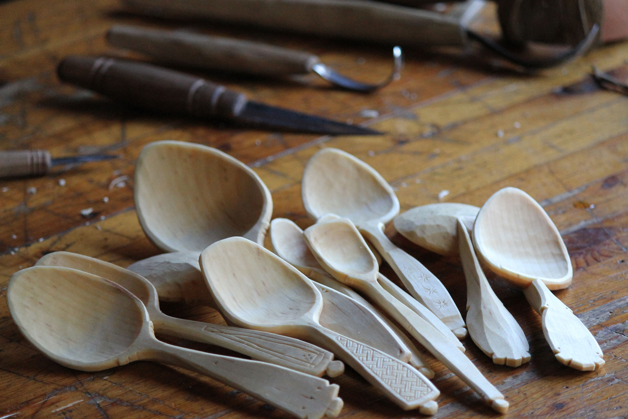 Jarrod: I use hand tools for most of my work, but I rough out bowl blanks with a chainsaw. The main tools I use for spoon carving are an axe, a straight-bladed carving knife (generally referred to as a Sloyd knife) and a few curved knives called hook or spoon knives. All of these have very, very old origins. For turning bowls, I use a foot-powered – or spring-pole – lathe. The tools that cut the wood while it is spinning on the lathe are referred to as hook tools. Like bowl turners of the past, I forge my own hook tools.