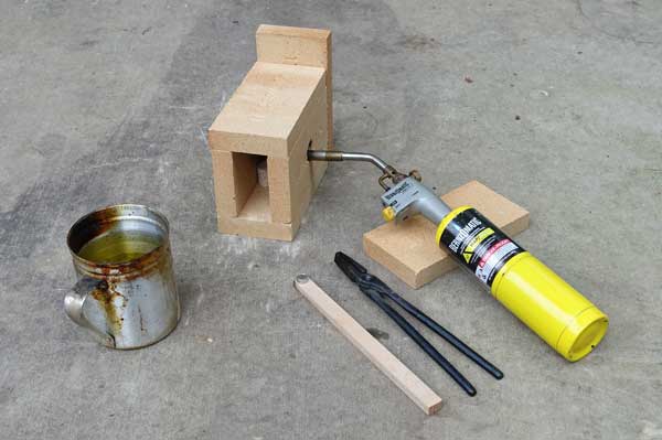 A firebrick enclosure helps to evenly distribute heat on the tool steel.