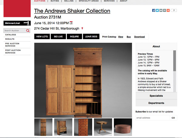 Skinner Auctioneers, in Marlborough, Mass., has an astounding collection of Shaker pieces from the Andrews Shaker Collection up for sale in a June 15 auction.