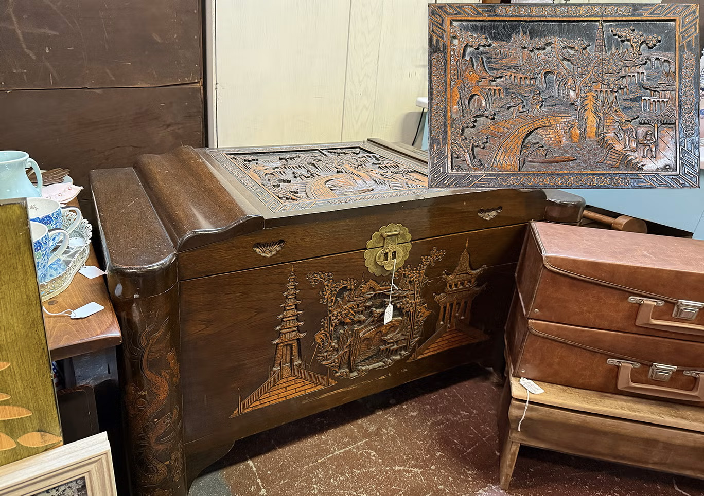 But the style was strictly Oriental and, as with art furniture, I just don’t like it. We have nothing of that style in our home, and it really wouldn’t fit anywhere. I did love the carving, and considered buying it, removing and trimming the top, and displaying it on a wall in my shop.