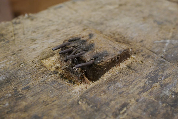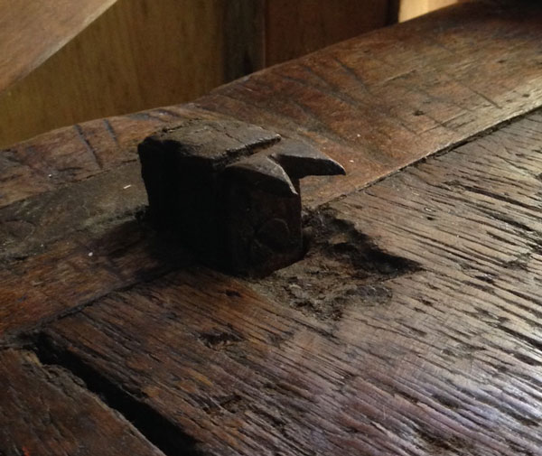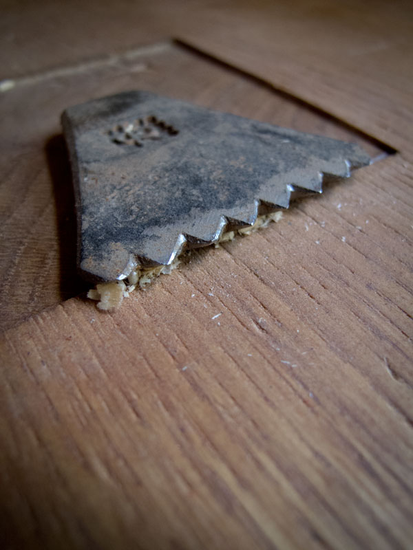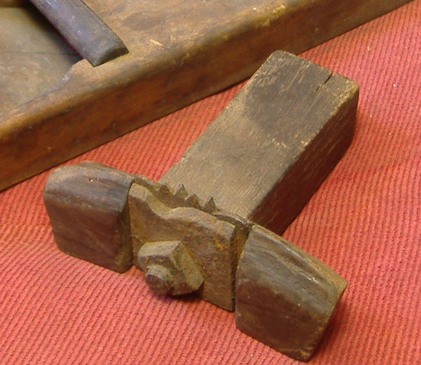 If you don’t believe that traditional craftsmen filed their teeth, check out this photo from Mark Firley of the blog The Furniture Record. This French stop has clearly been filed back over the years, as you can see by the recess that is cut into the bench to accommodate it. I also think it’s interesting how this stop is constructed. It looks like an L-shaped piece of iron or steel. One leg is attached to the wooden planing stop; the other leg is filed with teeth.