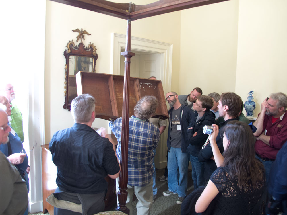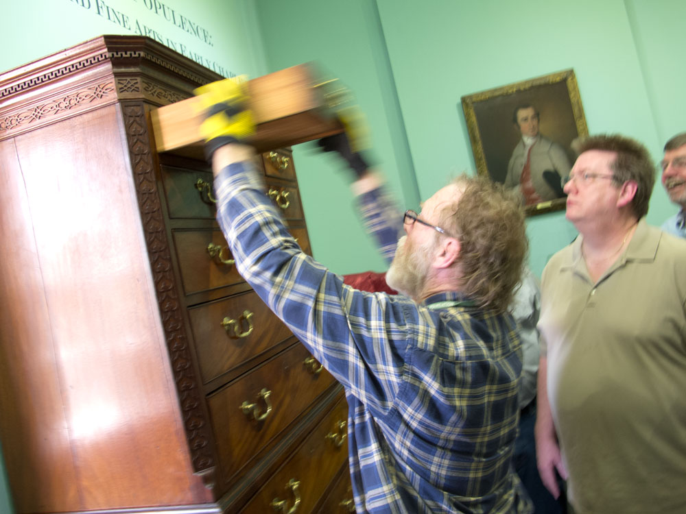 On Thursday, a group of about 20 furniture-makers received a pull-out-the-drawers tour of the collection held by the Nathaniel Russell house museum, one of the jewels of city. The tour was led by Brandy Culp, a curator at the museum who specializes in interiors, and Russell Buskirk, a furniture maker, restorer and conservator who has worked on many pieces in the museum.