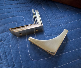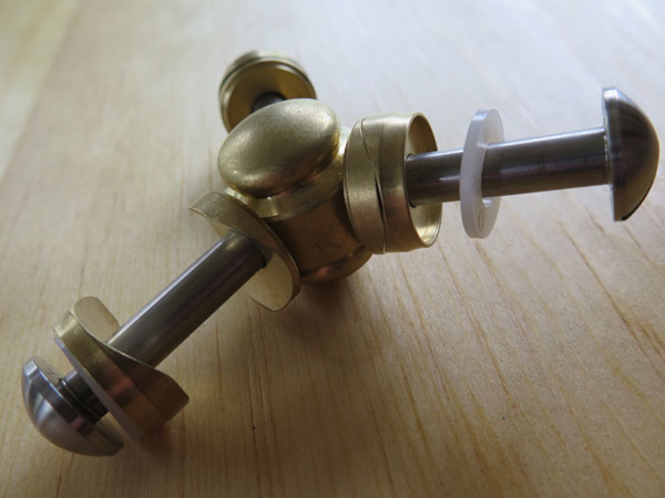 The production tri-bolts are just as good as the prototypes I tested. The only significant difference I can discern is the finish on the brass. Instead of a shiny surface, which was on the prototypes, the production hardware has a nice matte finish, which blends in better with the wood and leather textures.