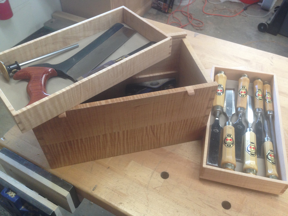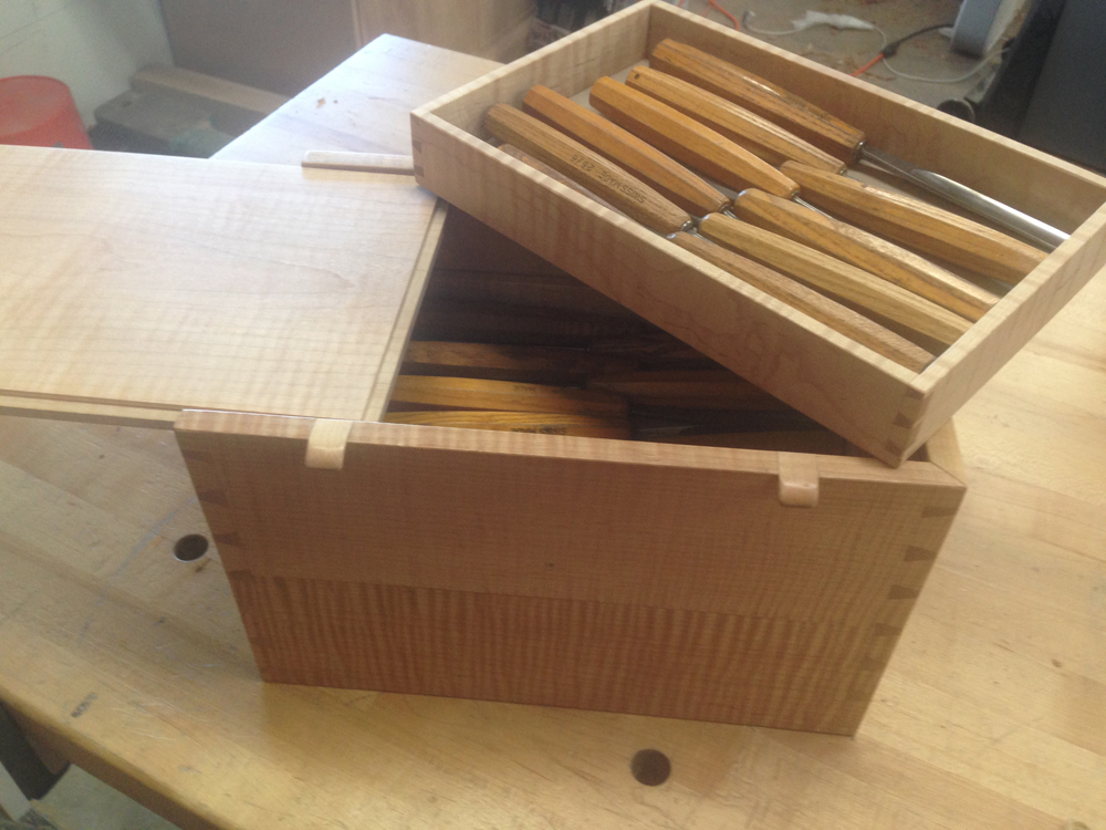 The first tool tote in the new box would house all my carving tools; four removable trays allowed for some expansion (although that is an unlikely need after 30 years of carving with the same tools).