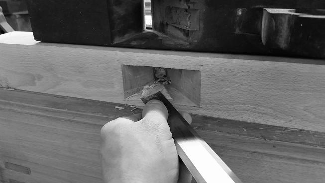 Whatever step I take next in this process of making a jack plane (see part 1 here), I like to have my muse close by and through looking at then trying to replicate, I gain more respect for the tool making art. From a distance the simple rectilinear form of jack, try and jointer planes do little to suggest the nuances and evolution present within them. It is only when I try to replicate what at first seems simple do I appreciate more fully how crisp the detailing is on the original and professionally made plane. I missed my float delivery at the weekend but look forward to collecting it from the depot tomorrow. In the meantime I’ve been working with a small Japanese-style pull saw and paring chisels to form the abutments and shape up the mouth/escapement.