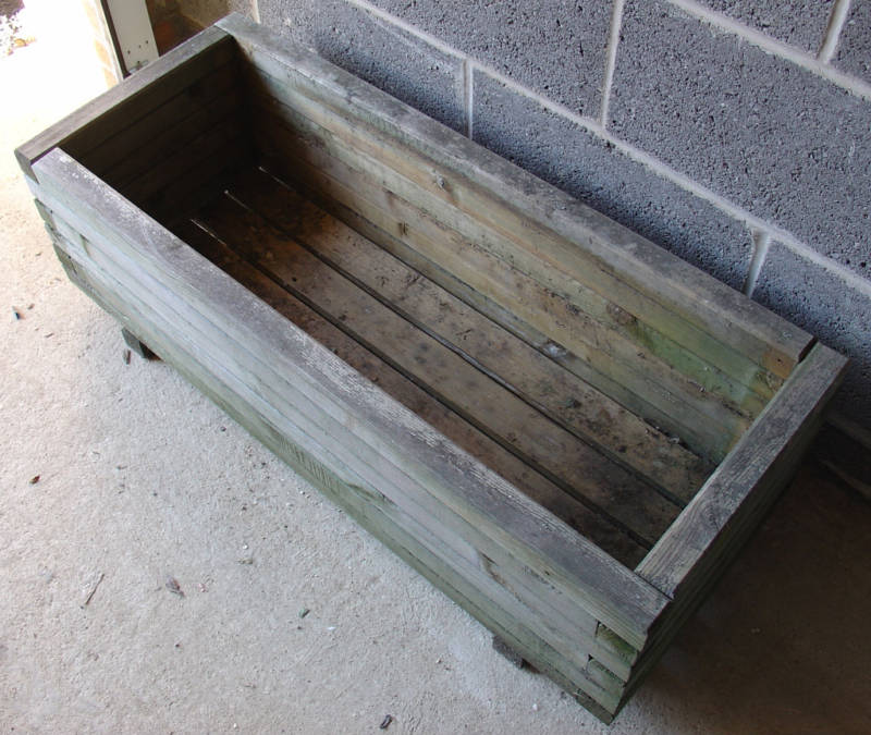 OFF CUTS OF PALLET WOOD.THIS HAS BEEN GLUED,BUT THE 4 CORNERS HAVE BEEN FIXED WITH A LENGHT OF DOWEL ROD 6 MM DIAMETER.THERE ARE NO SCREWS USED ON THIS.ITS ALL TIMBER ASSEMBLED AFTER MACHINING.IT HAS BEEN TANALISED GREEN.THE GREEN TANALISED PRESERVER WAS MIXED WITH CLEAN EARTH THEN IT WAS BRUSHED ON TO GIVE IT THAT WEAR AND TEAR USE LOOK..AS IF I HAD JUST MACHINED IT THEN ASSEMBLED IT?? THEN PUT IT IN THE GARDEN IT WOULD STAND OUT LIKE A SORE THUMB.BUT NOW IT LOOKS OLDE WORLDE AND DOES NOT STAND OUT IN THE GARDEN AMONGST OTHER PIECES OF POTS AND PLANTS.!!PLUS HAVING BEEN MADE FROM A PALLET YOU KNOW ITS ALL WEATHER PROOF.AS PALLETS ARE USED TO THE 4 SEASONS OF WEATHER.!!! WINTER / SPRING / SUMMER / AUTUM !!