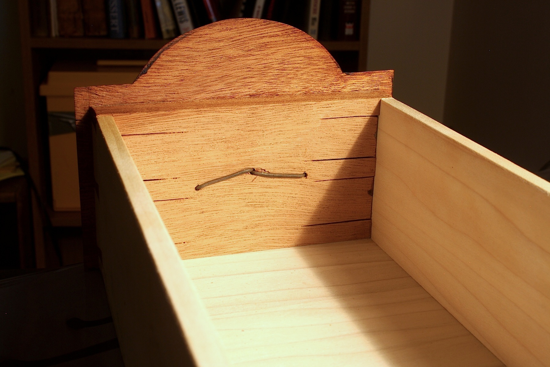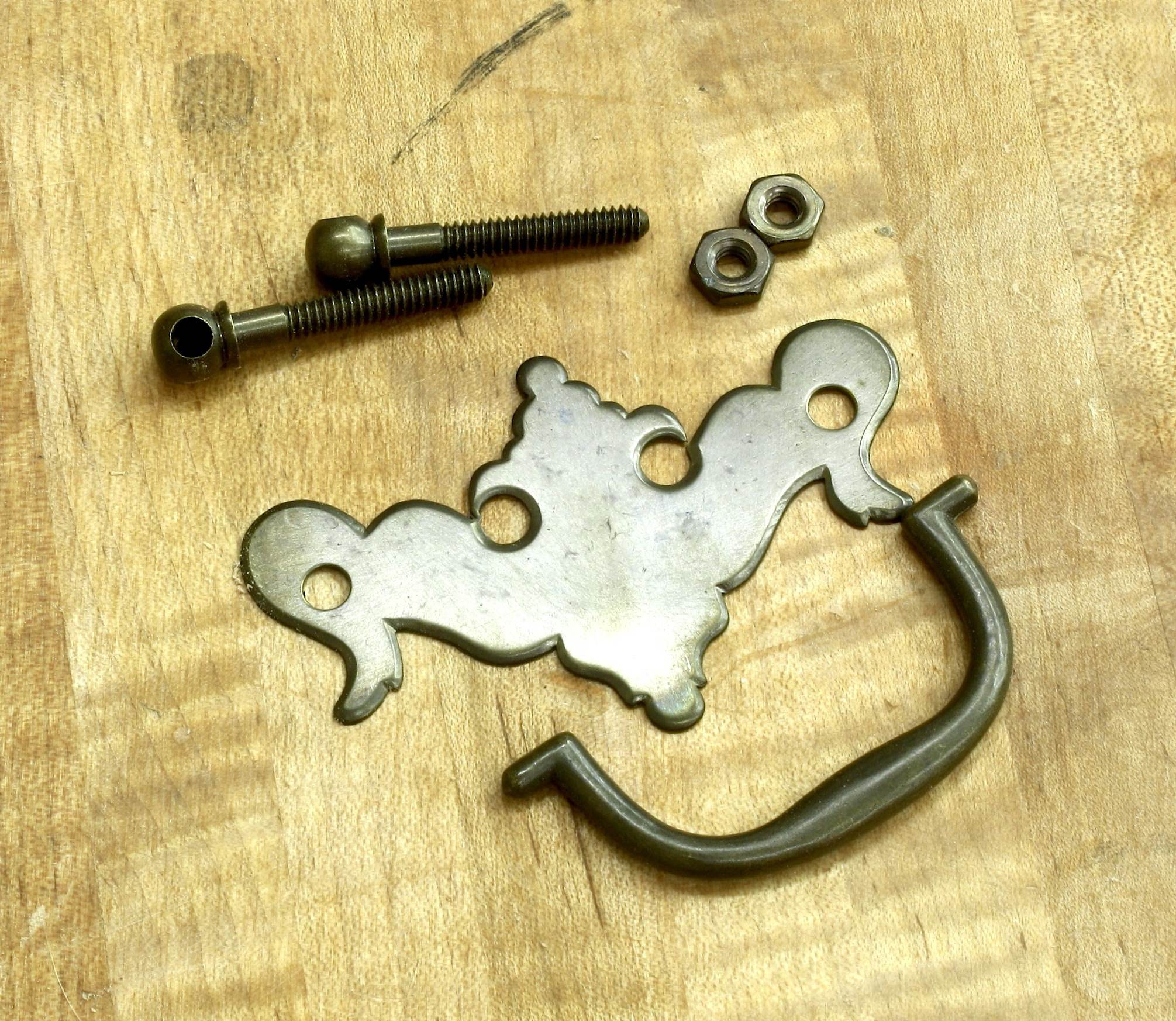 Installation of the Queen Anne hardware also begins with holes drilled through the drawer front. But from there, the posts are slid in and a nut is thumbed on – a better installation is to countersink an appropriate hole in the back face of the drawer, then cut the post so it does not extend beyond the inside edge of the drawer front when assembled. This keeps the post and nut from catching any contents stored in the drawer.