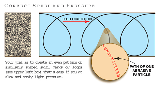 To make an even scratch pattern, slow to a crawl. You should take 5 to 10 seconds to go 6 in. Going too fast creates an uneven pattern, with long, drawn-out swirl marks at the top of the sanding path and a denser pattern of bunched up marks at the bottom. This also leaves an uneven surface, with more wood taken off at the path’s bottom than at its top.