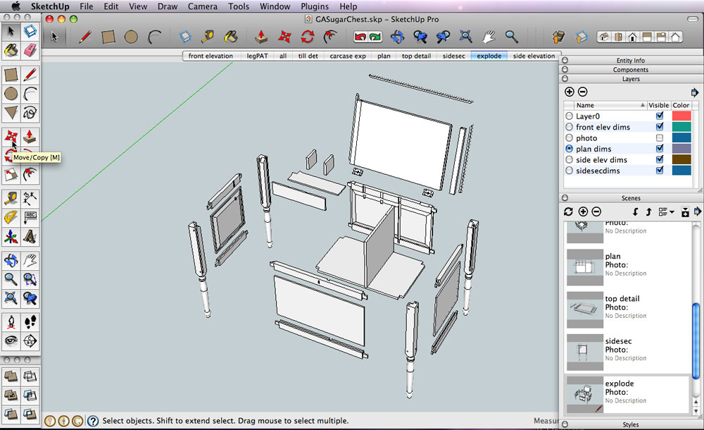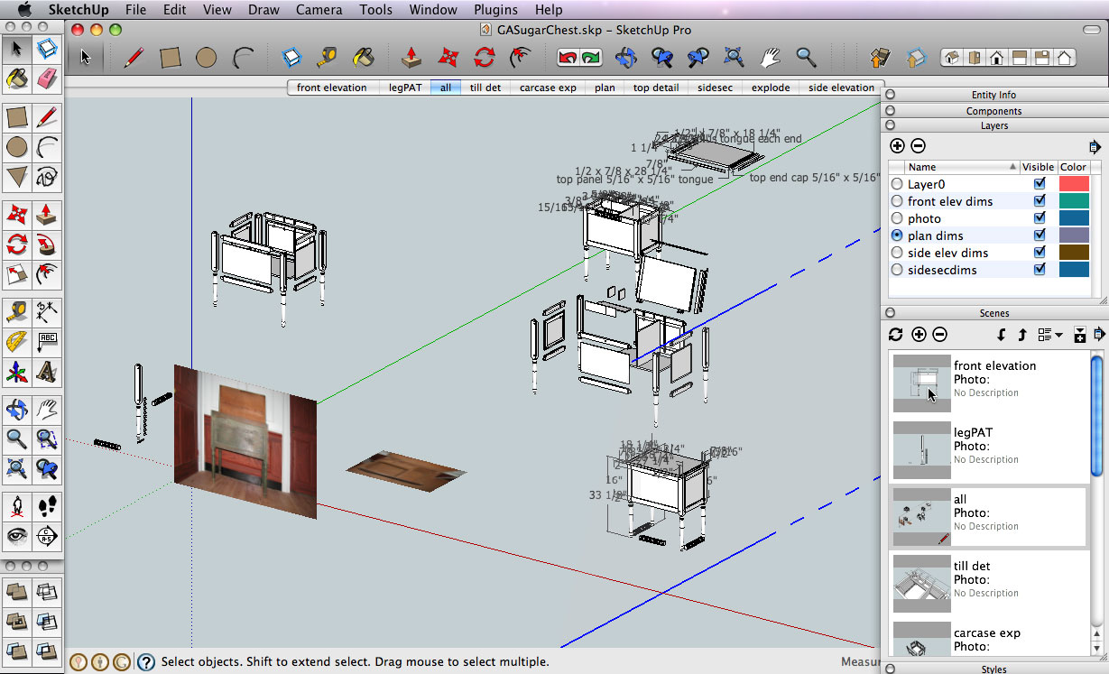 The screen shot above shows one of the completed models. I zoomed out to show everything in the model. The process starts with importing a photo, then scaling the photo to match known dimensions. We can zoom way in to measure parts off the photo, and we build a model adjacent to the photo. In addition to the photos, we had written reports on the pieces from the MESDA database. The process isn’t perfect, but we can come mighty close to an accurate depiction of the real piece. After the model is completed, we make copies of it in empty space to use for detail images. In the book, we show a 3D exploded view of each piece as well as standard front, side, plan and section views. Because every drawing is based on the same model, we’re confident about dimensions and details agreeing with each other in the final drawings.