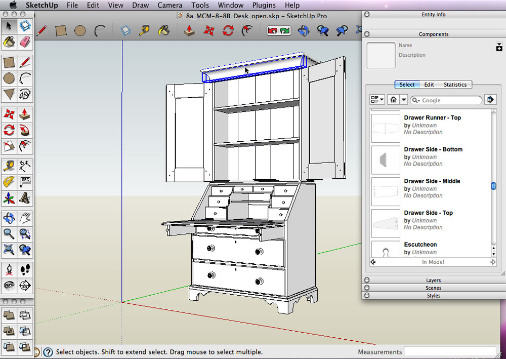 Here’s a more sensible view of part of the model, what will eventually become one of the exploded views in the finished book. Each part of the model is saved as a component, so we can take a model apart much as we would disassemble a real piece of furniture (without the fear of busting a priceless antique). I think these views are a tremendous help to understanding the construction, and if you’re not familiar with standard orthographic views, the exploded views help to make sense of the more mechanical views. Glen used a model of one of the pieces to build the cover project for the upcoming November issue, and having the SketchUp model available was a big help during the actual build, almost as good as having the real thing to refer to. In some ways it’s better than the real thing; any part can be closely examined and measured in SketchUp and you can make a dry run assembly on the computer before doing it for real in the shop.