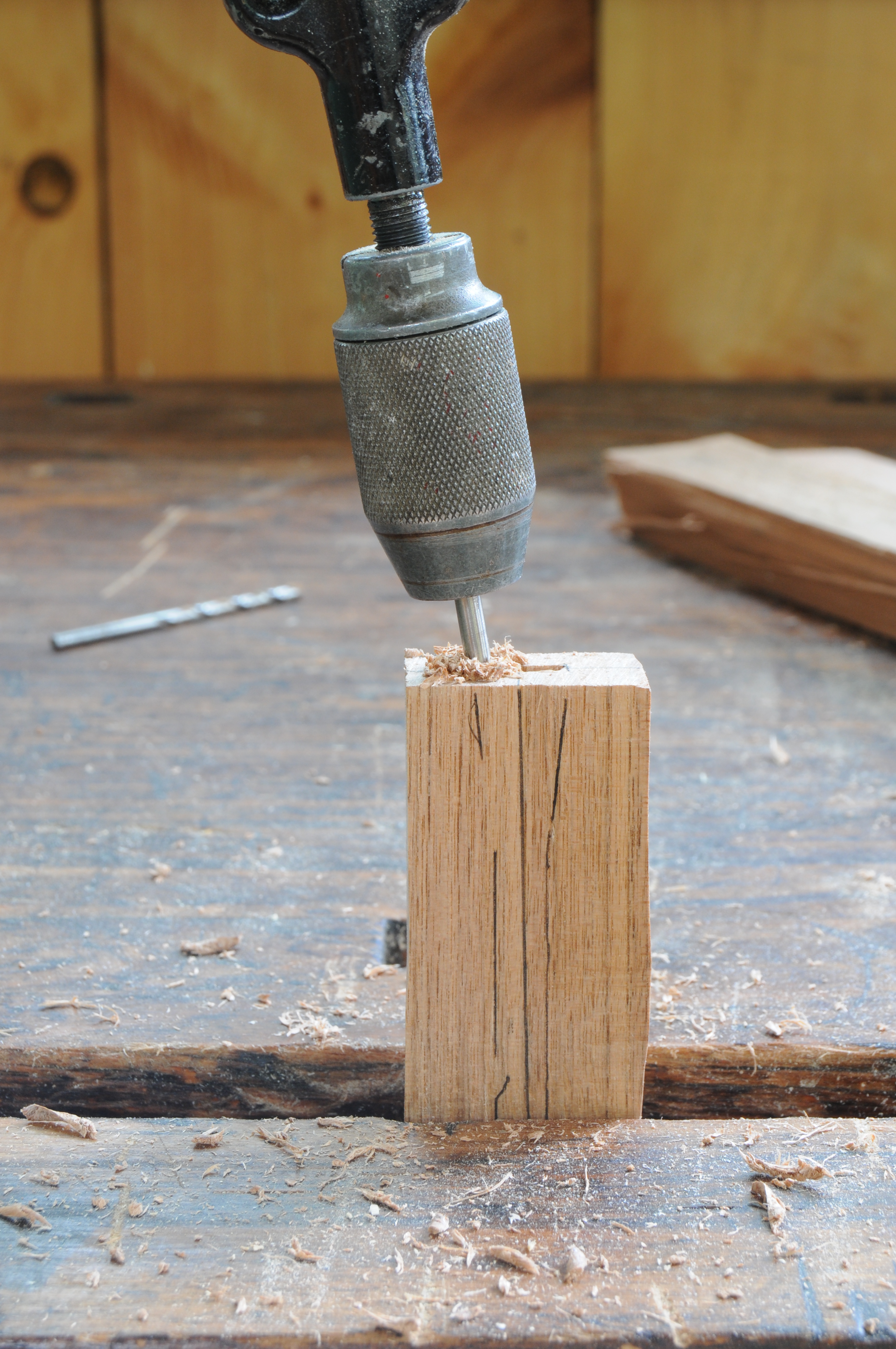 Make the opening. I use an egg-beater drill and eyeball its relationship to the centerlines marked on the blank. Then I mark the outline of the flared tang on the handle blank. I tilt the bit over as I crank the drill to widen the opening for the tang.