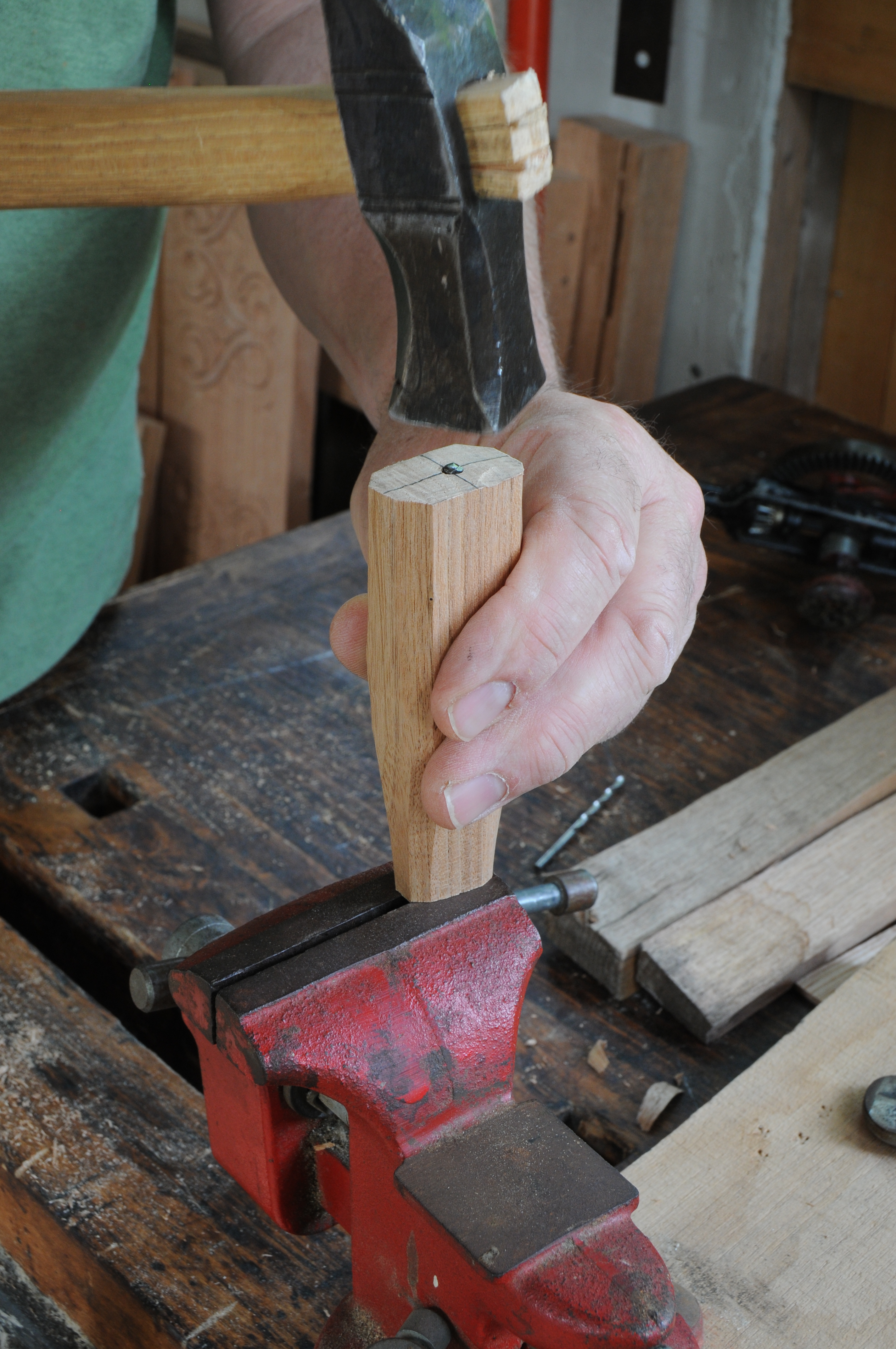 Once I’ve widened the holes enough I grip the blade in locking pliers and drive the handle on from below. I sit the blade in a dog hole on the bench for this step.
