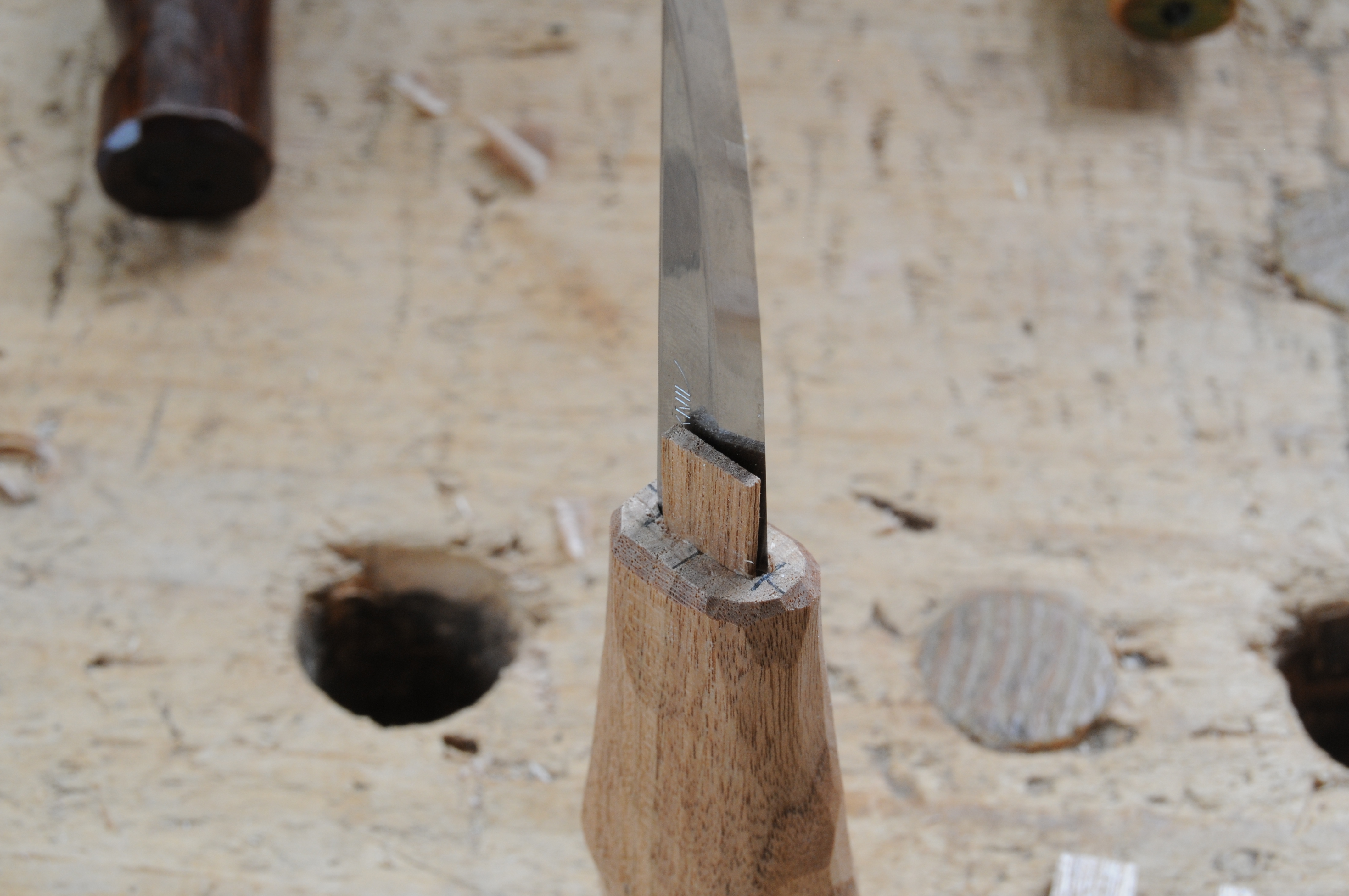 No glue required. I don’t bother gluing the blade into the handle, nor the wedges, but gluing won’t hurt. The bevel around the handle’s end is carefully cut with the tip of a slöyd knife.