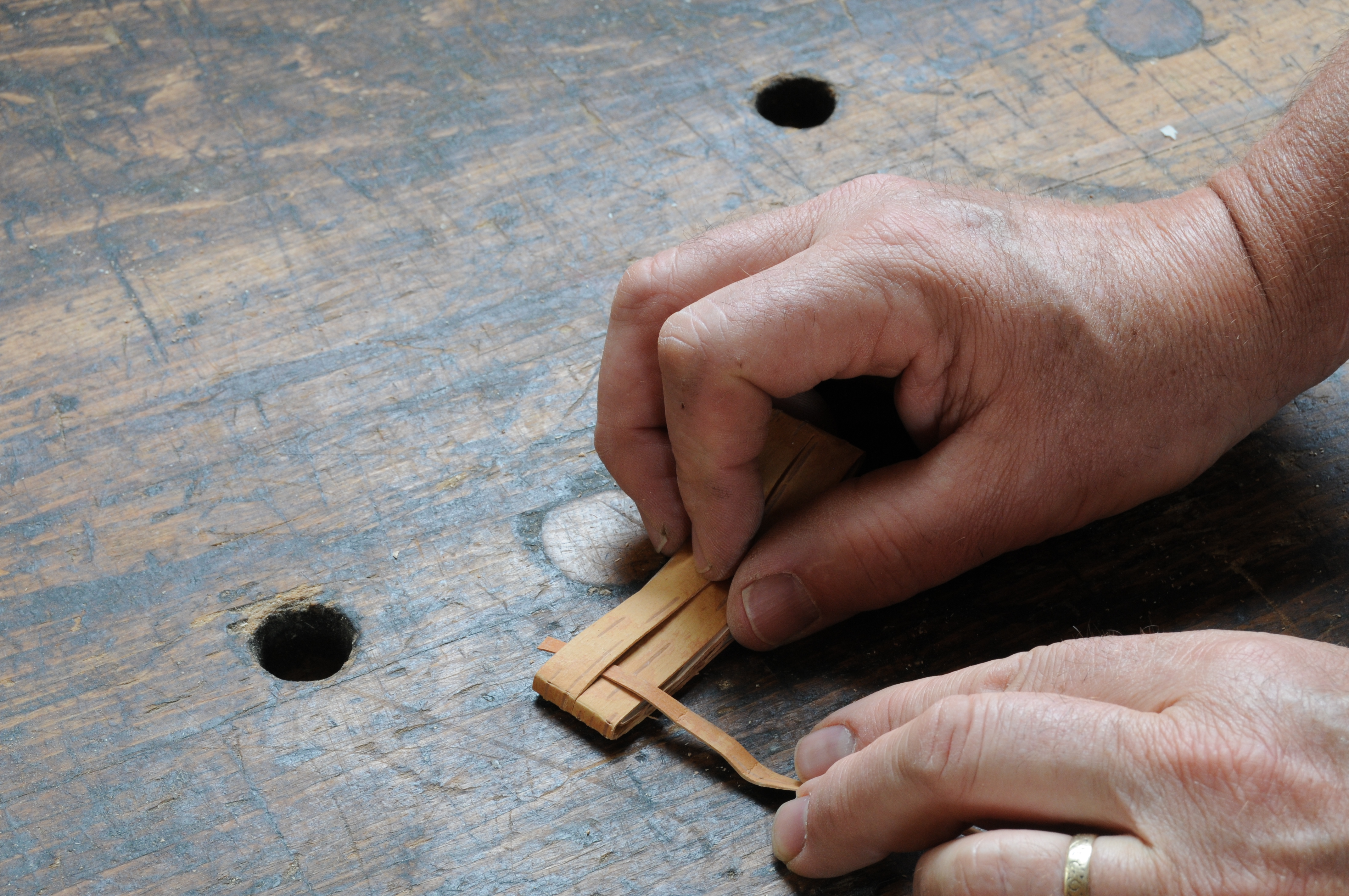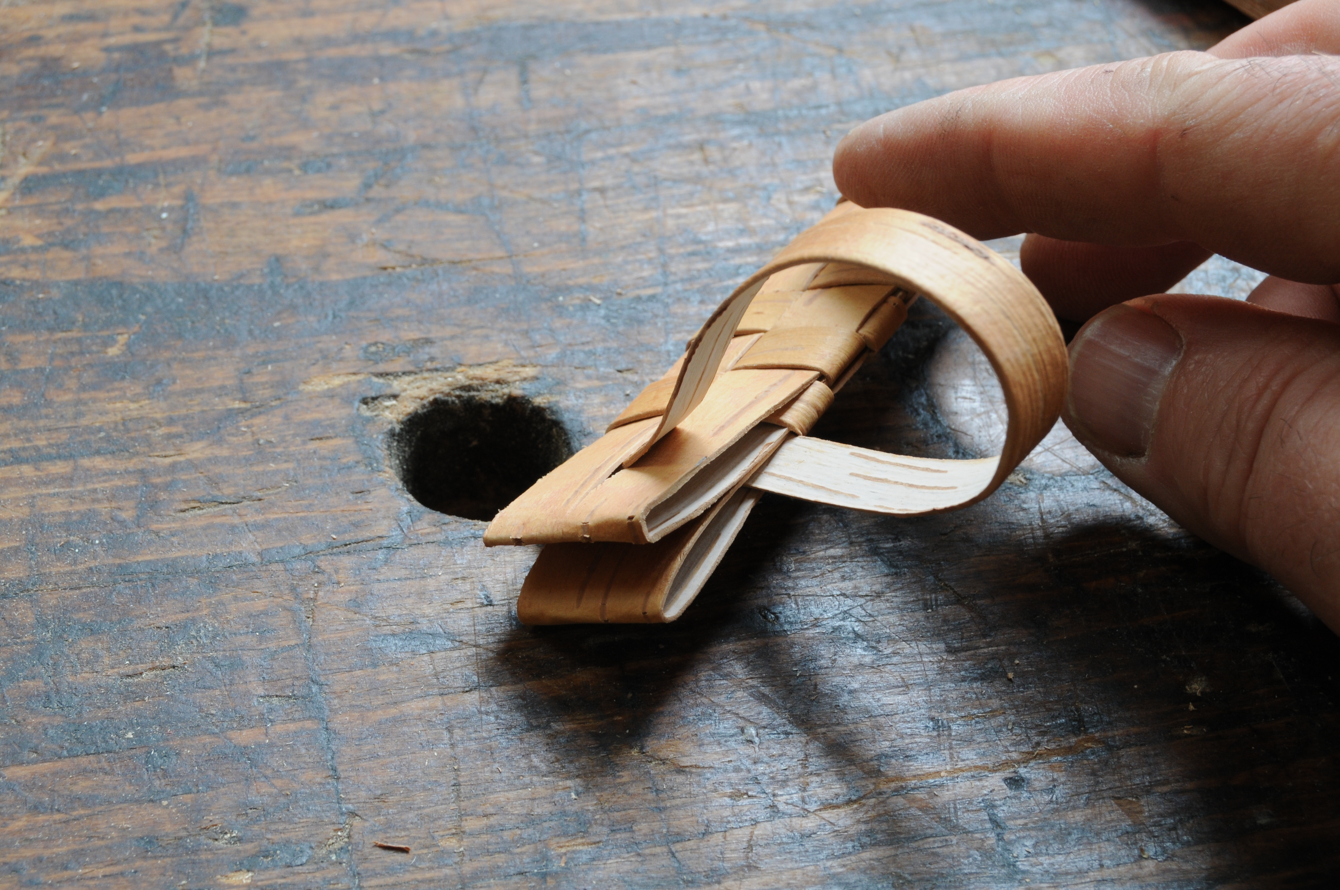 To make a sheath for the knife, I use strips of birch bark. Other bark–hickory, basswood/linden, elm and more – has all been used in one place or another. I have also used basket splints of both ash and oak for the same sort of sheath.