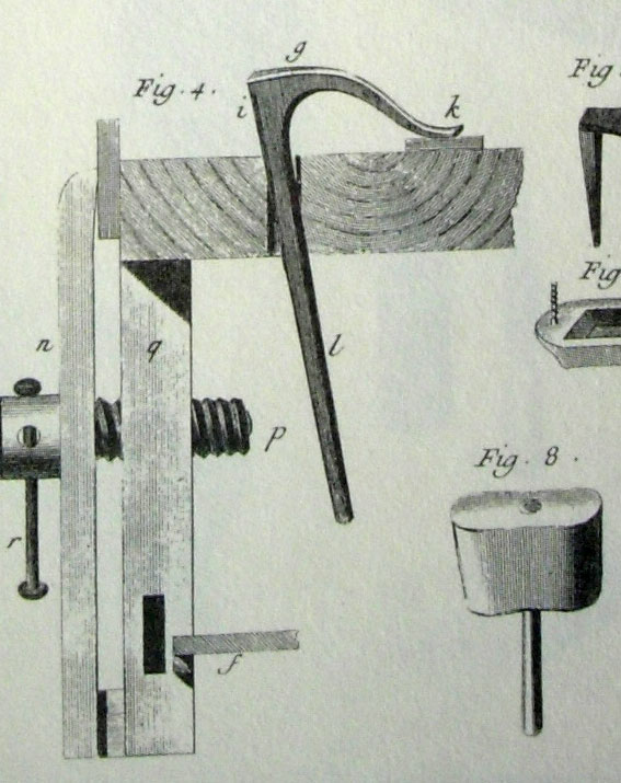 Holdfasts are tools made of iron and are used to hold the work on the bench firmly and stably. They are ordinarily 18” to 20” and even 24” long in the shank; their thickness must be between 12 to 15 (1-1/16” to 1-5/16”) lines, and the curve of their paws is 9” to 10” long by around 10” high. They must be of very soft iron, forged in one piece so they don’t break. All their strength is in their head. That is why we will observe that from the head g to the paw k, they get thinner so that their extremity only has two lines (3/16”) of thickness at the most, which will make them more flexible and increase their pressure.
