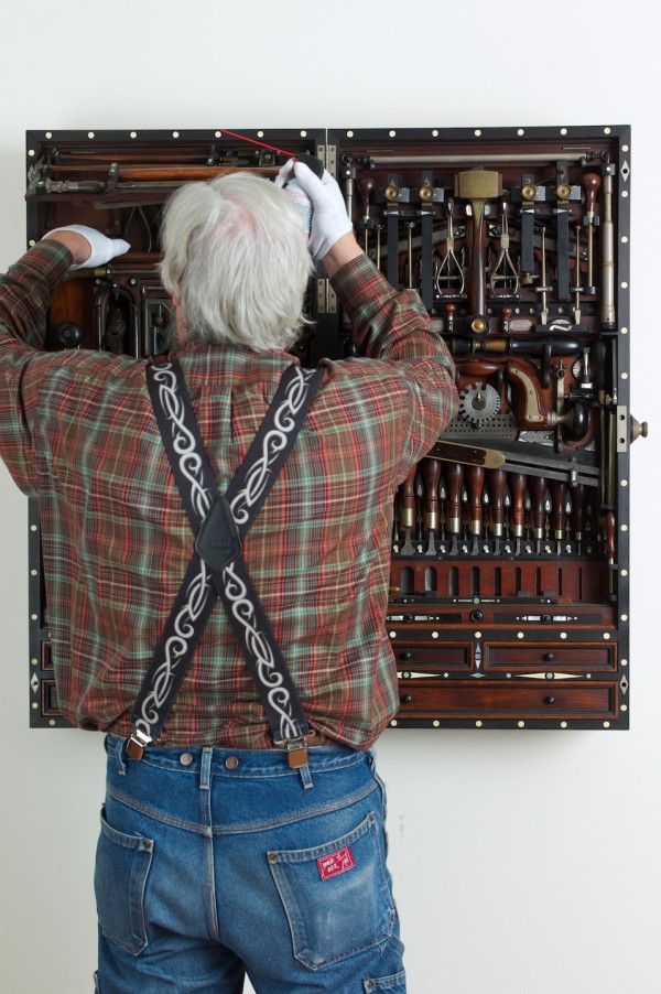 How? This one is easy: with consummate skill. All the workmanship is crisp and confident, and the composition and detailing demonstrate genuine inspiration. Clearly the cabinet was constructed specifically for the tools it houses, with all the spatial and aesthetic details resolved prior to starting.