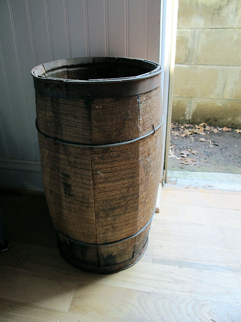 Anyway, back to the wastebasket. I didn’t want a plastic one. After some thought, I hit upon the perfect solution: an old nail keg. You can find these at antique stores for about $20 (or on eBay for more). They are well-made: coopered, bound in wire and with a steel lip. They are quite the pieces of craftsmanship.