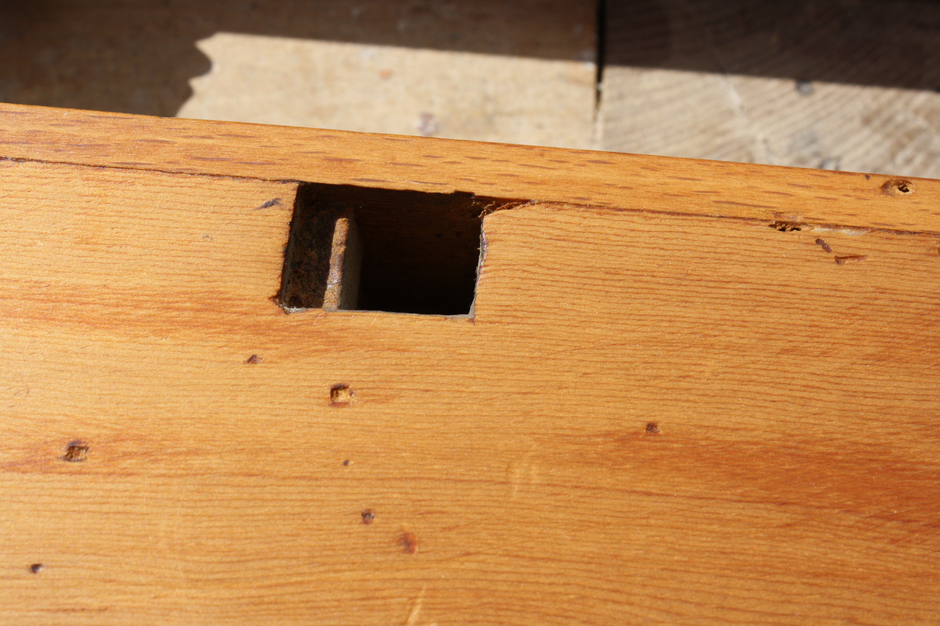 The dog holes look like they have been sawed out to the correct depth, and then chiseled out, then the side board of the slot has been glued on, making them dog holes. Actually a pretty neat idea, if you like square dog holes and don’t like mortising.