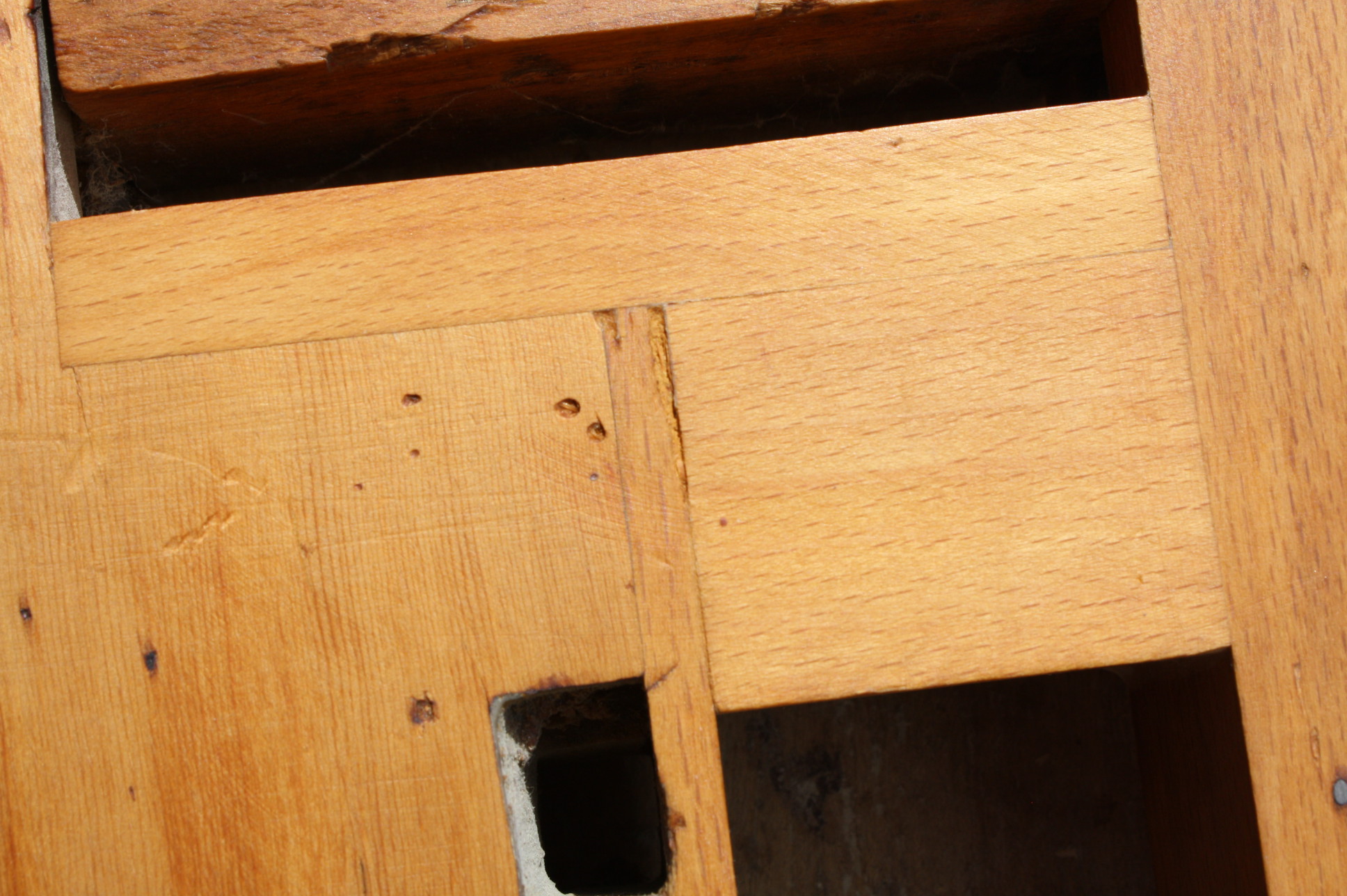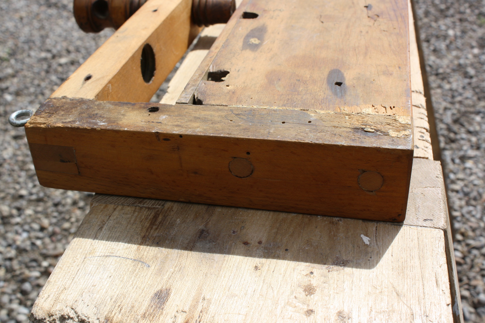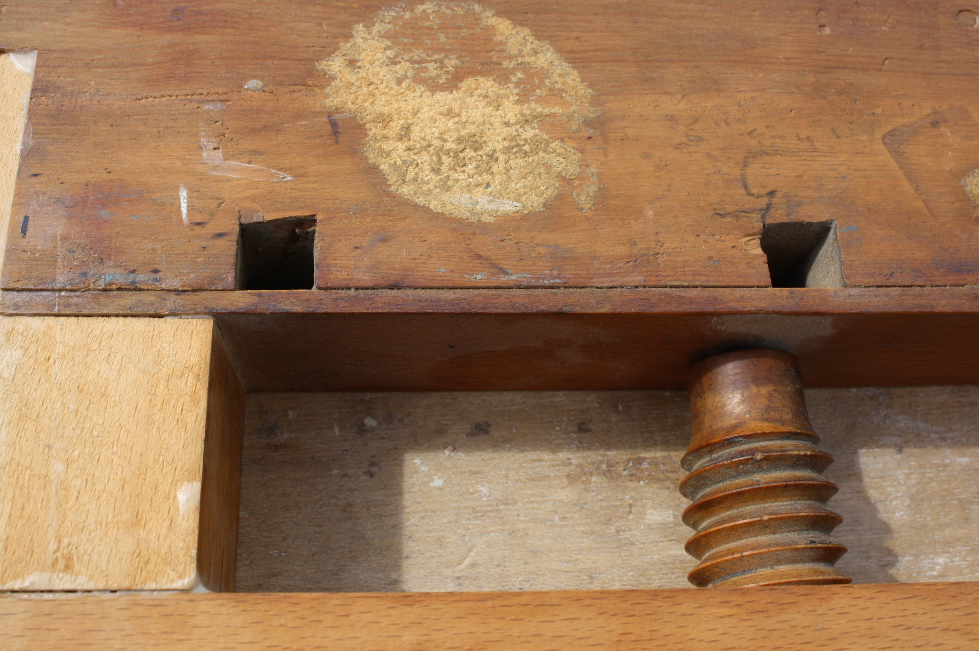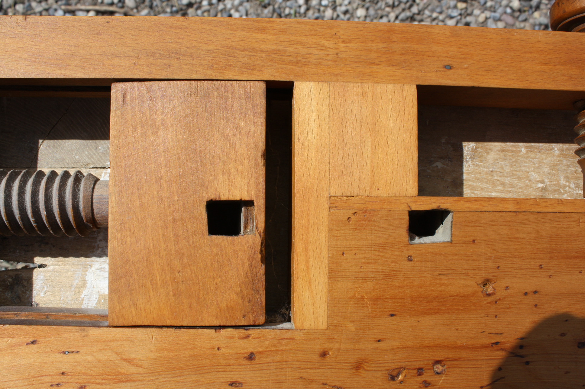 The front corner joints of the workbench are tenoned and reinforced using a peg (also beech).