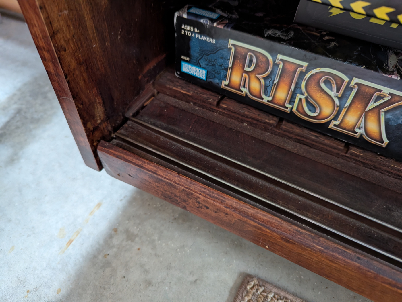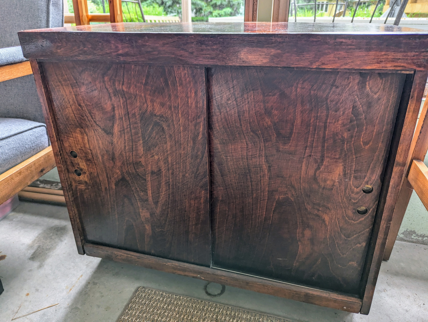 This oddity is actually very local: my own three-season porch. My Mom picked up this piece of furniture nearly 30 years ago at an auction in South Dakota. She later passed it on to me, and for the past few years it’s been living in my porch/dive bar as a game cabinet. What stands out to me is that this piece is simultaneously very ugly, yet undeniably functional. Given the blotchy nature of the staining, questionable grain orientation, and exposed plywood edges, it’s certainly a DIY piece of furniture. I can tell that it was originally built as a record cabinet, which implies it was probably built by someone young.