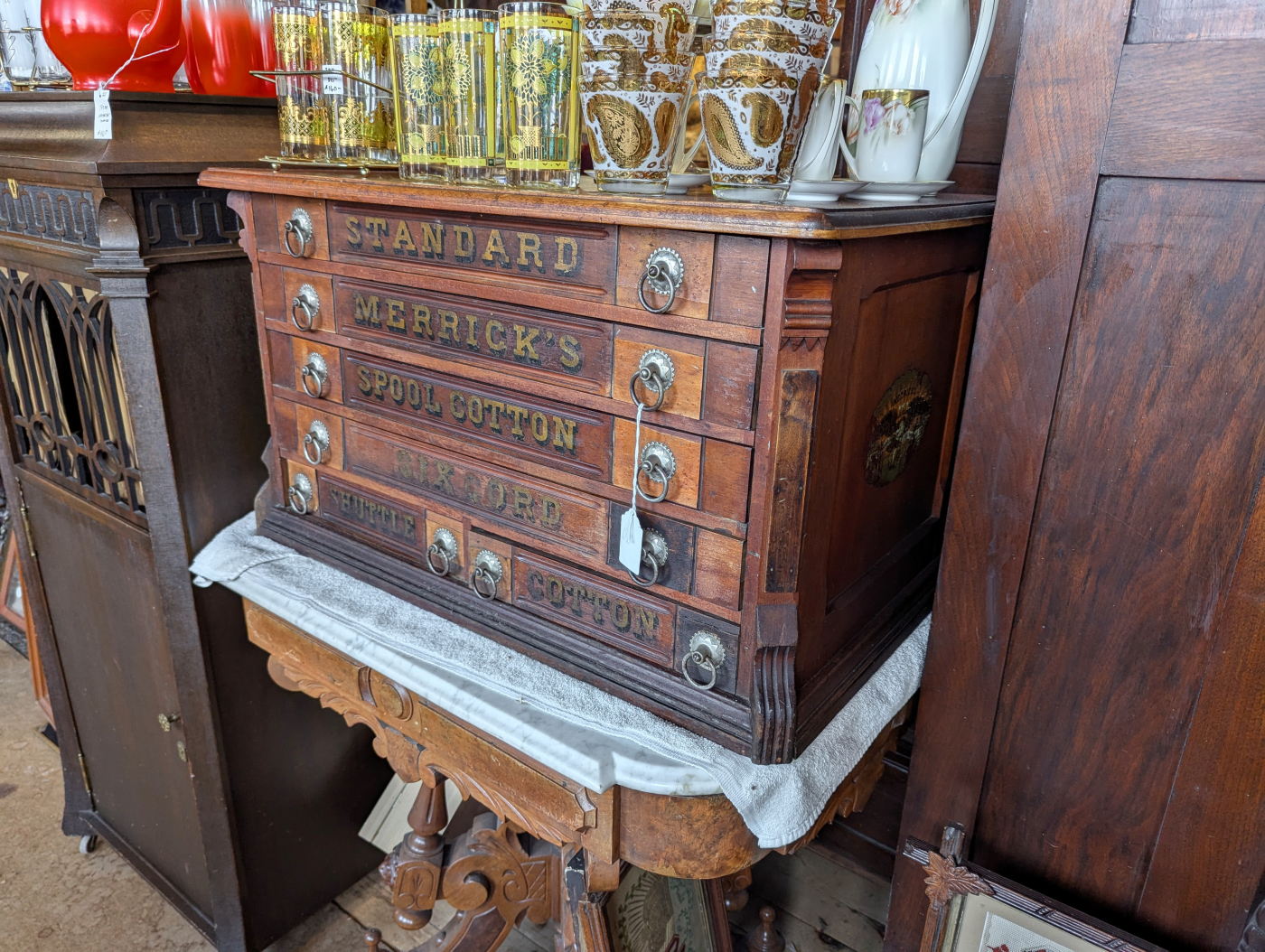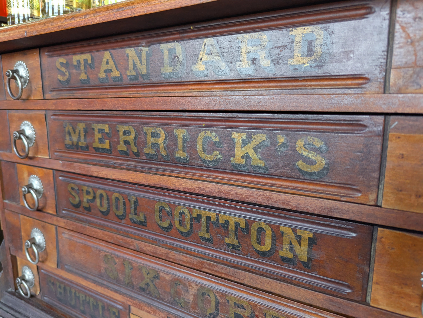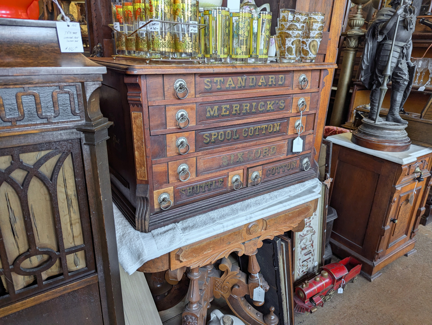 Unlike some other vintage spool cabinets that I’ve seen, this one is unrestored and has clearly gotten a lot of use over the years. It was interesting to see both the similarities and differences as well, like the dual bottom drawers in this example, which I think I like more. For those curious, they can learn more about the Merrick Thread here and here.