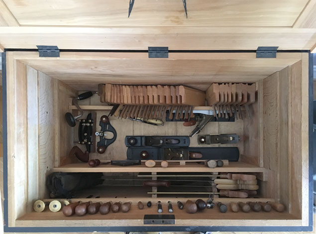 The tools at the bottom of my chest are the heavy and expensive stuff – the planes and saws that get constantly used. At the back of the chest are my moulding planes. And the front wall of my chest has a tool rack that contains the stuff I need to grab without even looking at it.