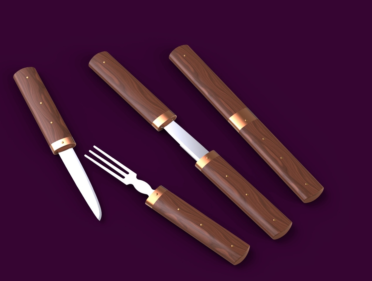 This might just be the coolest fork and knife set I’ve ever seen. The mahogany handles are riveted to the metal tangs of the fork and knife. But what is crazy is that the fork and knife slide together to make a compact traveling set.