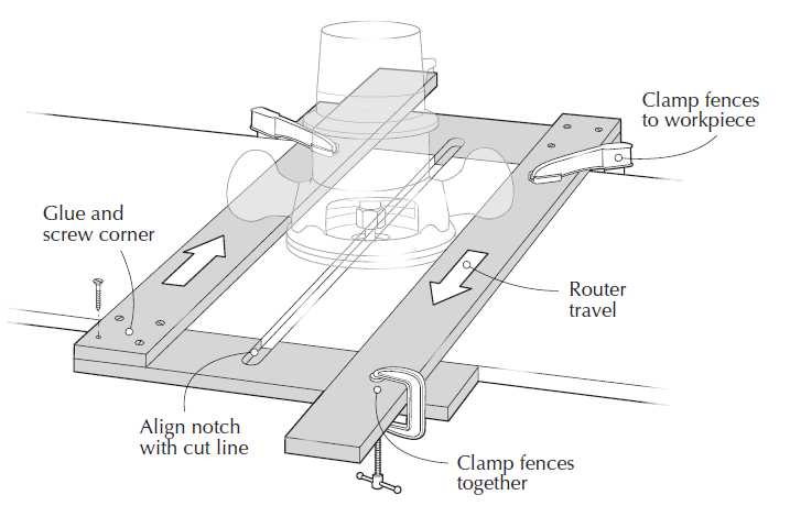 Pushing the router forward against the left-hand fence, then pulling it back against the right-hand fence, yields the exact width of cut in two passes, as long as you’re using a bit that’s at least half the width of the desired cut.