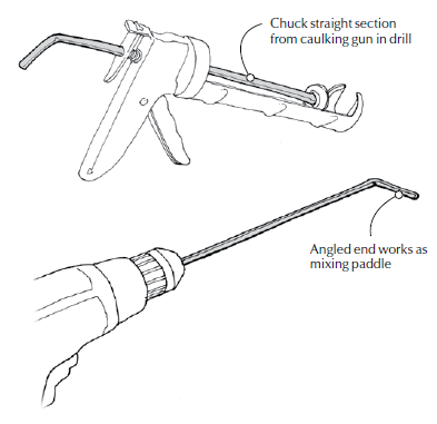 When I needed to mix two different paint colors to create a new one, I came up with the idea of removing the rod from my broken caulking gun and mounting it to my drill to serve as a paint stirrer. The straight section fit into my drill chuck without modification, while the angled end served beautifully as a rotating mixing paddle. I used my cordless drill to power the mixer, but a corded drill running at low speed would work fine.