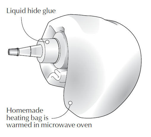 My quick trick is to use a magic heating bag warmed in a microwave oven to bring the temperature to about 120 degrees Fahrenheit. I then wrap it around the glue bottle for 20 seconds or so. The heating takes a minute or so, including the microwaving, and it’s all done dry. Use a meat thermometer first to check how long it takes to warm up the bag to 120 degrees and note the time for future use.